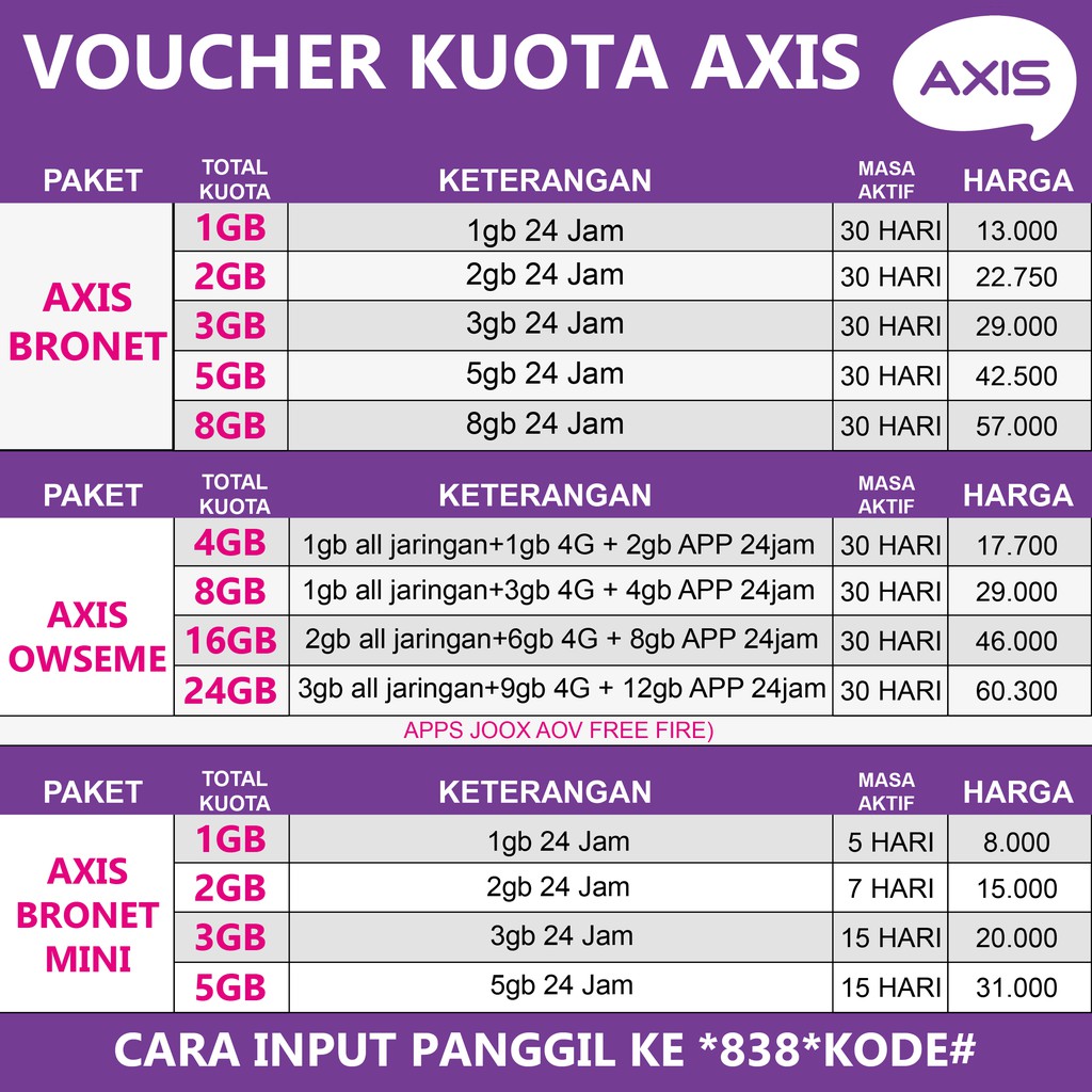 Paket internet axis cocok untuk kamu yang menginginkan kuota harga murah dan. Sudah tahu apa itu kuota lokal axis dan cara menggunakannya? Cara mengecek sisa kuota internet axis sendiri bisa dicek menggunakan. Registrasi ulang profil, berbagi pulsa, mengetahui lokasi gerai axis yang ada di . Kamu bisa menggunakan cara beli paket axis berikut:.